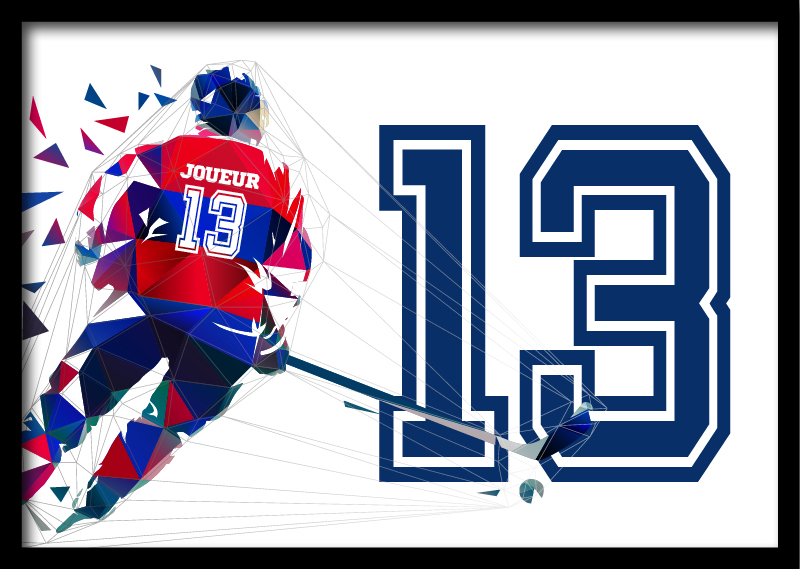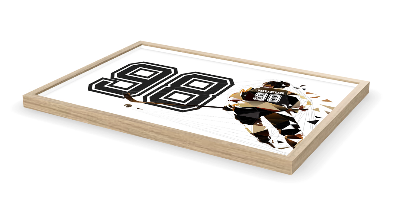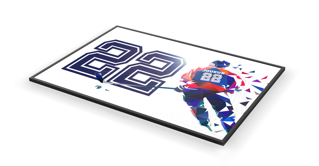 Amateur de hockey ou de soccer... chaque cadre est personnalisé avec le nom du joueur, son numéro et sa latéralité. La couleur de l’uniforme est ajustée à l’effigie de votre équipe.
